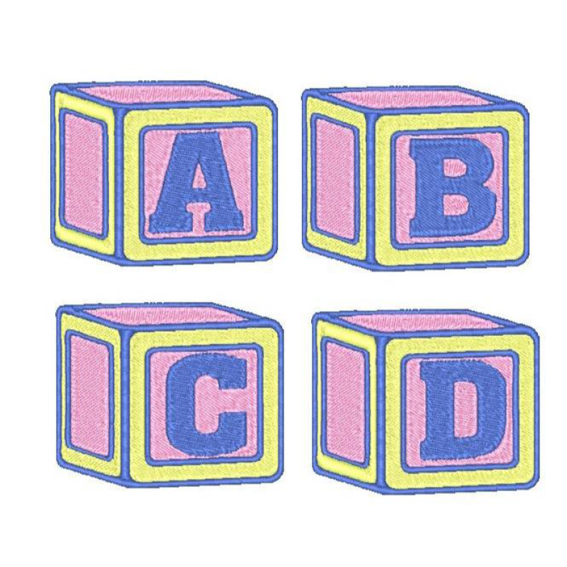 Baby Block Alphabet Set Machine Embroidery Designs Available in Embroidery Machine Formats EXP Melco, DST Tajima, JEF Janome, Elna, Kenmore, EXP Bernina, PES Brother, Babylock, Deco, PEC Brother, Babylock, Deco, VP3 Husqvarna, Viking, Pfaff, HUS Husqvar