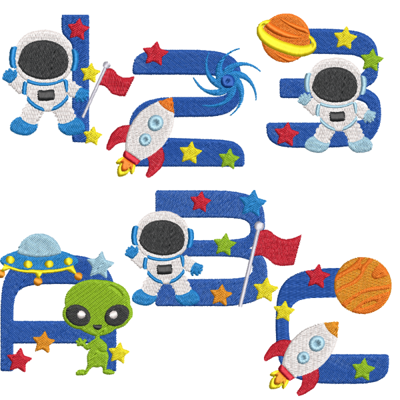 Space Alphabet Set Machine Embroidery Designs Available in Embroidery Machine Formats EXP Melco, DST Tajima, JEF Janome, Elna, Kenmore, EXP Bernina, PES Brother, Babylock, Deco, PEC Brother, Babylock, Deco, VP3 Husqvarna, Viking, Pfaff, HUS Husqvarna, V