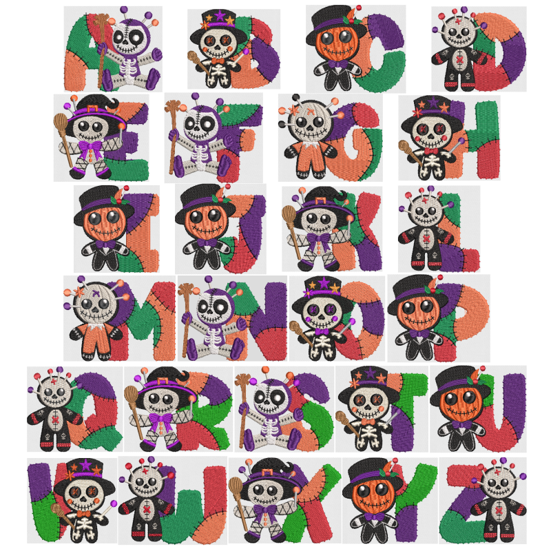 Voodoo Dolls Alphabet set will fit in a 100mm x 100mm (4" x 4") hoop. Available in Machine Embroidery Formats EMB, EXP, DST, JEF, EXP, PES, PEC, VP3, HUS, PCS, XXX, CSD.